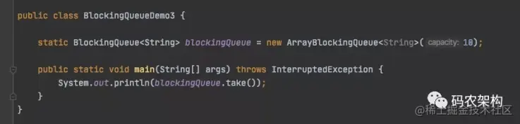 主要展示了阻塞队列为空时产生阻塞,我们创建一个最大长度为10的阻塞队列,然后没有生产者产生数据,却又一个消费者调用take消费数据。由于阻塞队列为空,所以产生了阻塞。