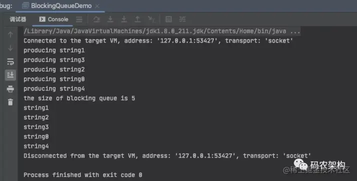 在分析 ArrayBlockingQueue的实现原理之前我们先通过几个例子来了解它的使用。例子一中我们创建了一个 ArrayBlockingQueue对象,然后通过五个线程去生产数据并put到阻塞队列,二主线程则充当消费端,不断将阻塞队列中的数据取出消费。程序输出如下: