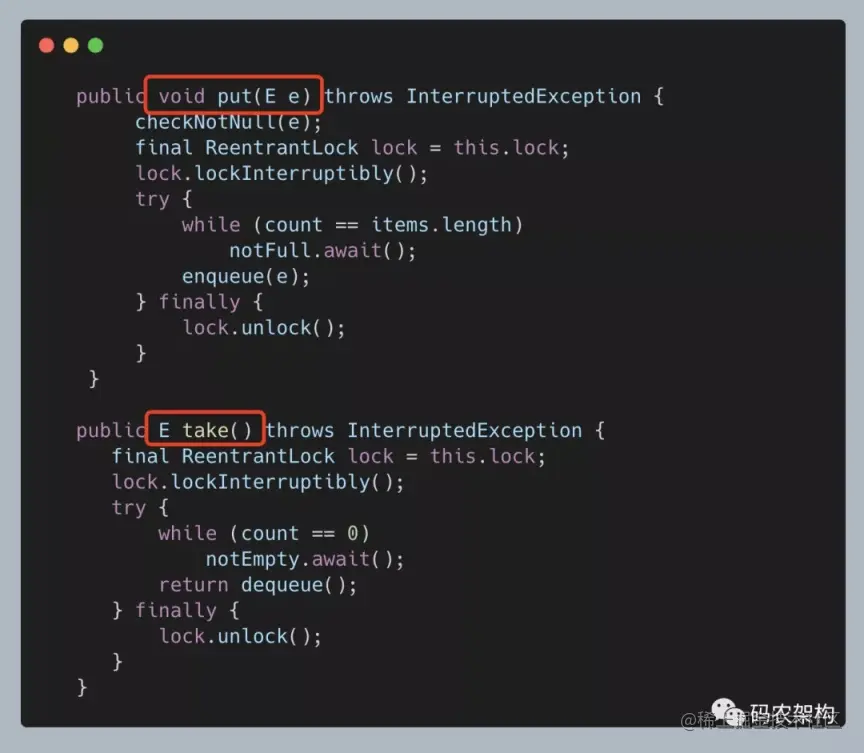 put和take方法是阻塞队列的入队和出队方法,它们会间接调用enqueue和dequeue方法。其中put方法会检查入队的元素不能为null,需要先获取锁后才执行enqueue方法维护数组,如果数组长度已经达到最大长度则调用notFull条件的await方法等待。take方法会先获取锁后才执行dequeue方法维护数组,如果数组长度为0则调用notEmpty条件的await方法等待。