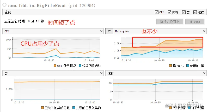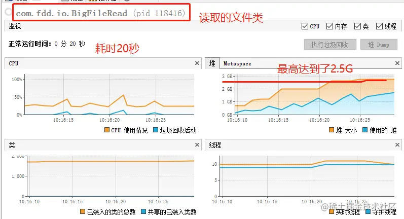 我们一个500M的文件,堆内存最高竟然2.5G,如果我们读取一个2G的文件,可能我们的电脑直接死机了就。