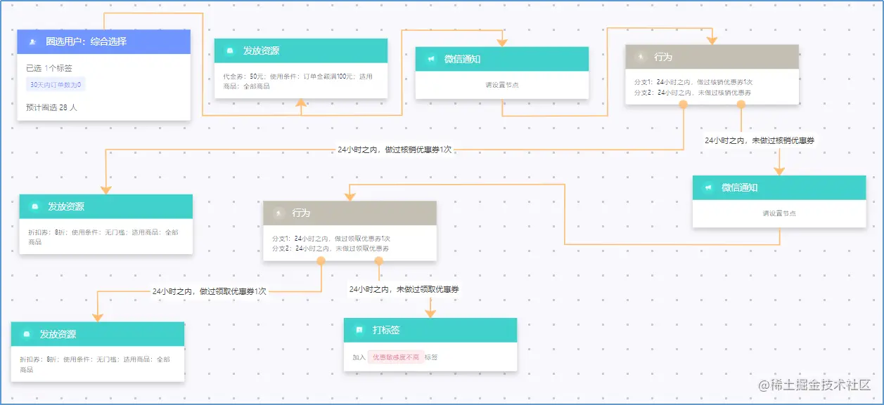 结合会员的生命周期,系统提供预制的自动营销模板,方便调用;丰富的节点工具、拖拉拽方式的节点配置、所见所得,直观生动。