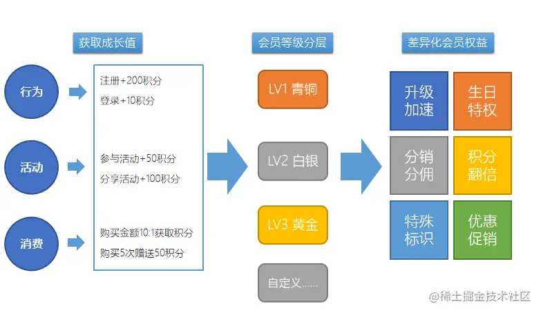 会员权益体系:培养客户忠诚度,包含有积分中心、积分商城、成长值中心、会员等级分层、差异化会员权益等。