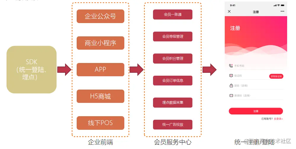 会员小程序(用户端):横向拉通全域会员的权益,由会员中心提供统一的登陆SDK,无论任何渠道注册的会员,都可以无障碍登陆企业其它APP、小程序、客户端,享受统一的会员权益。
