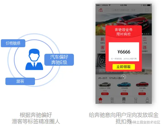 精准营销:营销活动精准定向,提升用户成交率 示例:给已经流失但快要保养的⽤户定向发放保养折扣券