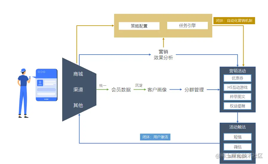 大会员体系,可以帮助企业把不同渠道的用户数据标准化之后整合在一个平台上。连接多个触点,搜集用户的行为数据并分析其活跃度,在此基础上建立标签和用户画像。对用户数据积累、识别、合并,生成客户完整生命周期旅程。