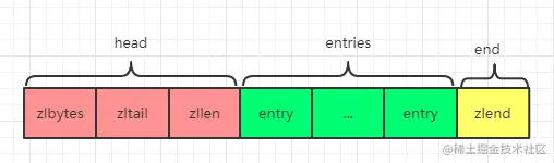 其中 zlbytes,zltail,zllen 为 ziplist 的 head 部分,entry 为 ziplist 的 entries 部分,每一个 entry 代表一个数据,最后 zlend 表示 ziplist 的 end 部分,如下图所示: