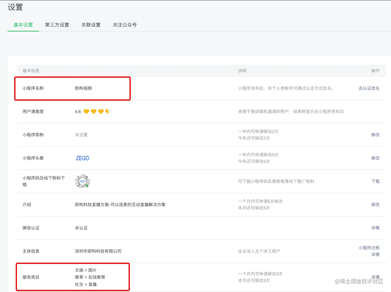 登录微信小程序后台,在“设置>基本设置”中,确定小程序主体/类目为可接入直播功能的类目。