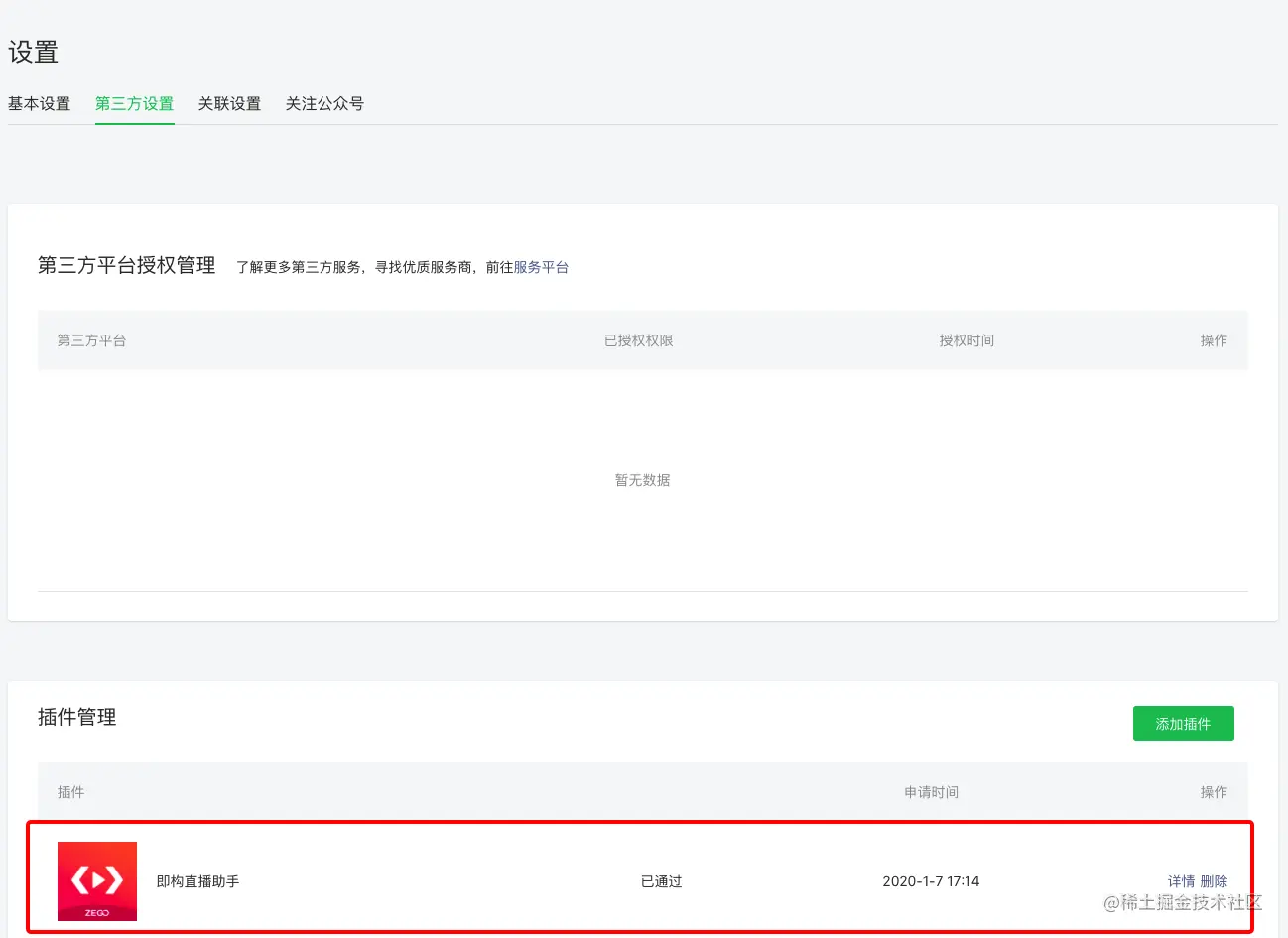 在小程序管理后台的“设置-第三方设置”中选择“添加插件”,在弹出的面板中搜索“即构直播助手”,选中插件并添加,等待后台审核。