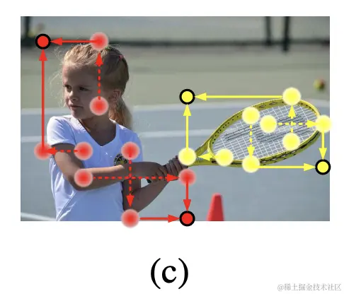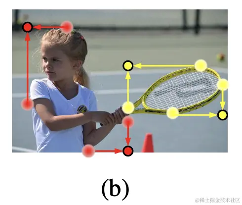 由于角点通常在目标之外,缺少目标的相关信息,CornerNet使用corner pooling来解决这个问题,如图b所示,取边界方向的最大值作为分数,但这会导致角点过于关注边界信息。