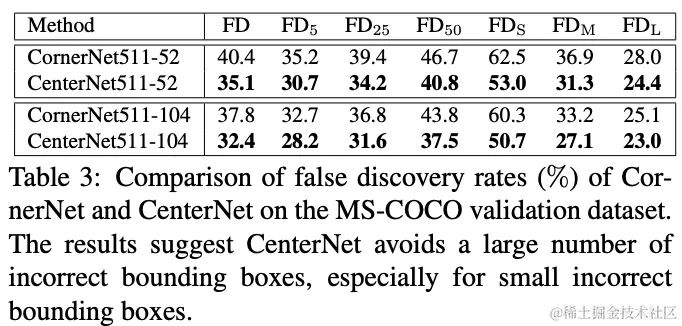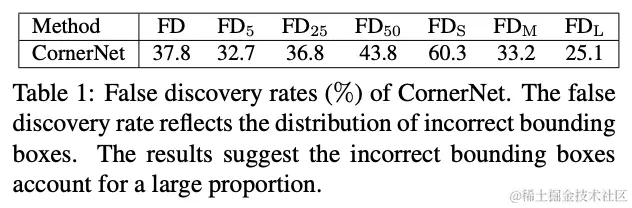 论文对CornerNet的误检率进行了分析,如表1所示,大部分的误检集中在低IoU区域,有32.7%的预测结果与GT的IoU低于0.05,而小目标的误检率高达60.3%,可能的原因是CornerNet无法感知目标内部的信息,这个问题可以通过ROI池化二次分类来弥补,但是计算消耗很大。于是,论文提出高效的替代方案CenterNet,在CornerNet的角点对上再加入一个目标内部点组成三元组,以最低的成本捕捉目标的内部信息。