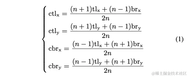 中心区域的大小对检测结果有直接的影响,区域过小会导致小目标召回率低,而区域过大则会导致大目标准确率低。为此,论文提出了尺寸可知(scale-aware)的中心区域,能够根据预测框的大小进行调整。定义和为预测框的左上角点坐标,和为预测框的右下角点坐标,和为中心区域的左上角点坐标,和分别为右下角点的坐标,四个点应满足以下关系: