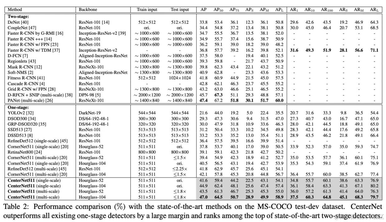为了解决CornerNet缺乏目标内部信息的问题,CenterNet使用三元组进行目标检测,包含一个中心关键点和两个角点。从实验结果来看,CenterNet相对于CornerNet只增加了少量推理时延,但带来了将近5个点的AP提升。