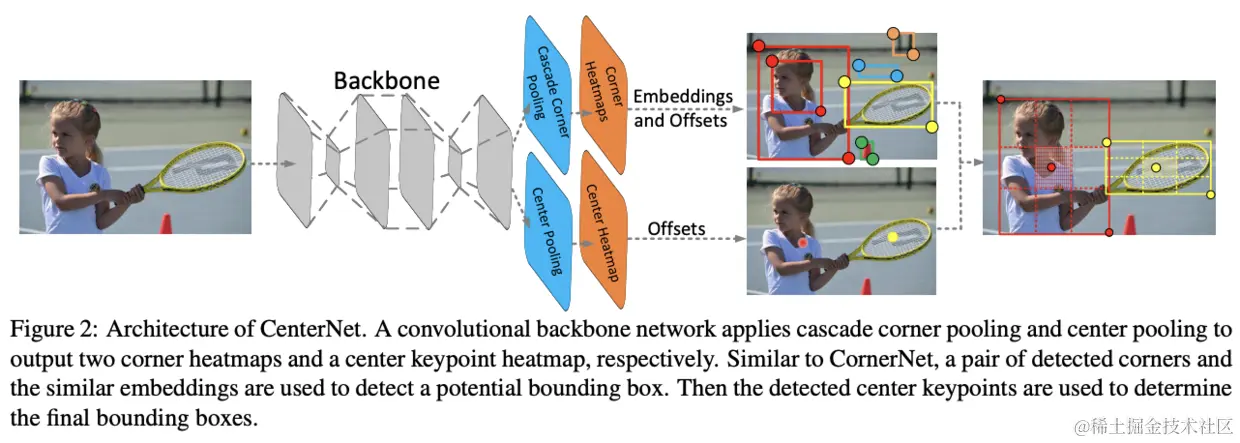 CenterNet以CornerNet为基础,为了检测角点,CornerNet分别预测左上角点和右下角点的热图。另外,为每个角点预测了embedding向量和偏移值,相同目标的角点的embedding向量距离会非常小,偏移值则是对角点进行小范围调整。最后分别选择top-k个左上角点和top-k个右下角点,根据embedding向量距离进行配对,预测框置信度为角点对的置信度均值。