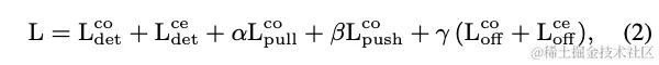 和为focal loss,用来训练网络检测角点和中心关键点,和为角点pull损失和push损失,用来最大化和最小化embedding向量的距离,和为L1损失,用来调整角点和中心点的偏移值。