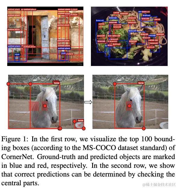 CornerNet将目前常用的anchor-based目标检测转换为keypoint-based目标检测,使用角点对表示每个目标,CornerNet主要关注目标的边界信息,缺乏对目标内部信息的获取,很容易造成误检,如图1所示。为了解决这个问题,论文提出CenterNet,在角点对的基础上加入中心关键点组成三元组进行检测,既能捕捉目标的边界信息也能兼顾目标的内部信息。另外,为了更好地提取特征,论文还提出了center pooling和cascade corner pooling,分别用于更好地提取中心关键点和角点。
