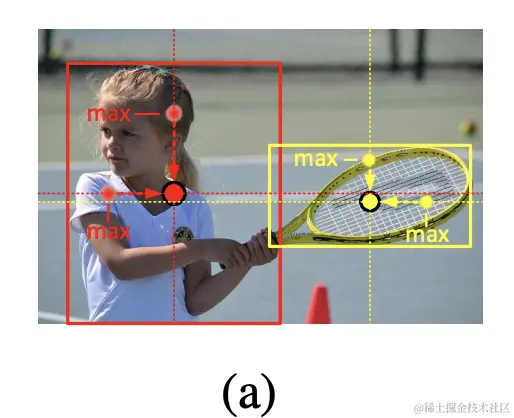 如图a所示,主干网络输出特征图后,在判断中心关键点时,取特征图水平方向和垂直方向的最大值之和作为分数,这样能够很好地帮助中心关键点的检测。