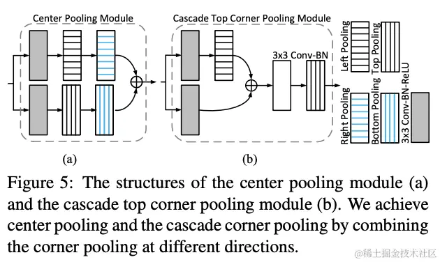 Center pooling和cascade corner polling可通过组合不同方向的corner pooling进行简单实现,如图5所示。需要注意,图5b为cascade top corner pooling模块,只输出左上角点在top方向值,还要加上cascade left corner pooling输出的left方向值。cascade left corner pooling的结构跟图5b类似,只是交换Top pooling和Left pooling的位置。