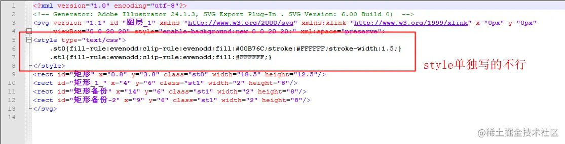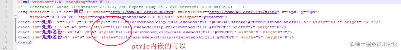 一通排查,发现上面问题的原因是:在svg代码中,style的写法问题。style单独写不行,需要内嵌到dom元素中,如下图: