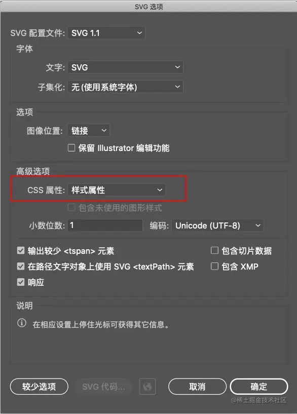 解决方法,用 AI(Adobe Illustrator) 软件导出SVG文件时,CSS属性栏选择“样式属性”,style就会内嵌到dom元素中了。下图是导出时的正确选项,更深入的可以参考这篇文章