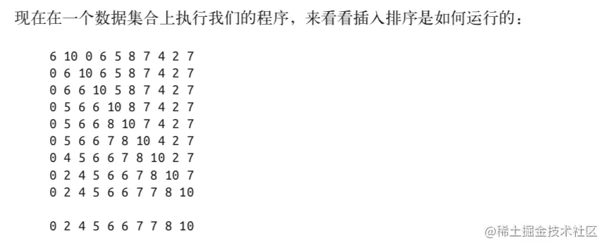插入排序有两个循环。外循环将数组元素挨个移动,而内循环则对外循环中选中的元素及 它后面的那个元素进行比较。如果外循环中选中的元素比内循环中选中的元素小,那么数 组元素会向右移动,为内循环中的这个元素腾出位置,就像之前介绍的姓氏卡片一样。