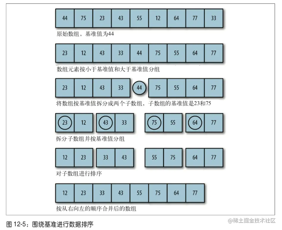 这个算法首先要在列表中选择一个元素作为基准值(pivot)。数据排序围绕基准值进行, 将列表中小于基准值的元素移到数组的底部,将大于基准值的元素移到数组的顶部。