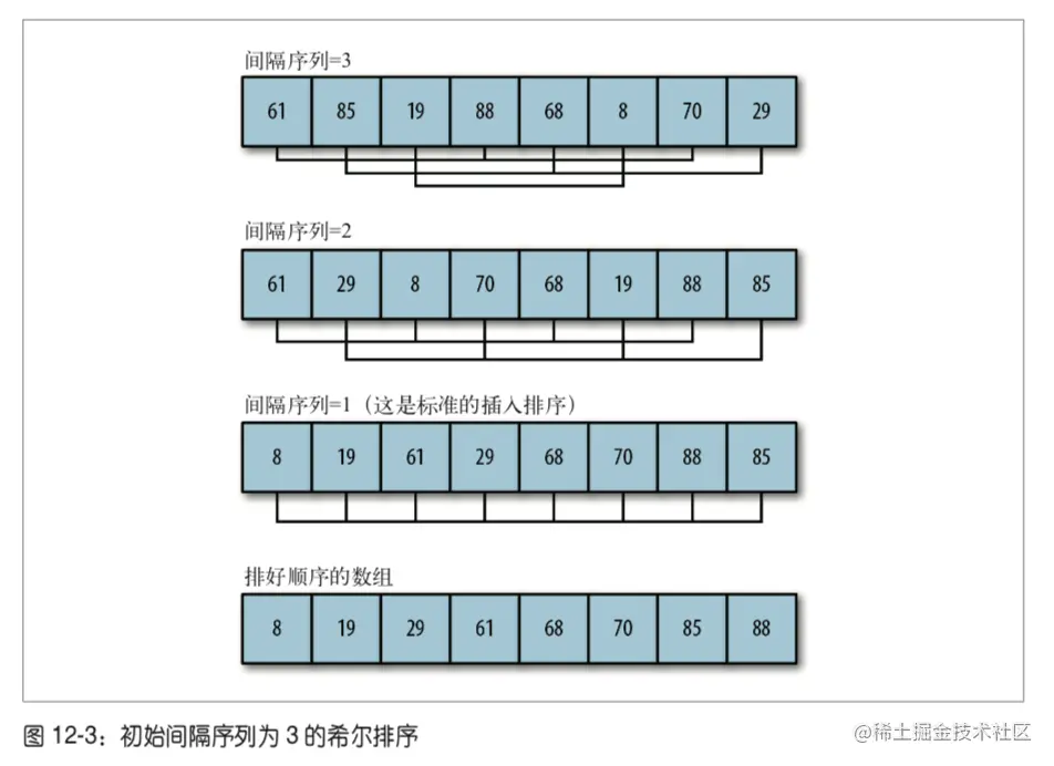 希尔排序的工作原理是,通过定义一个间隔序列来表示在排序过程中进行比较的元素之 间有多远的间隔。我们可以动态定义间隔序列,不过对于大部分的实际应用场景,算法 要用到的间隔序列可以提前定义好。