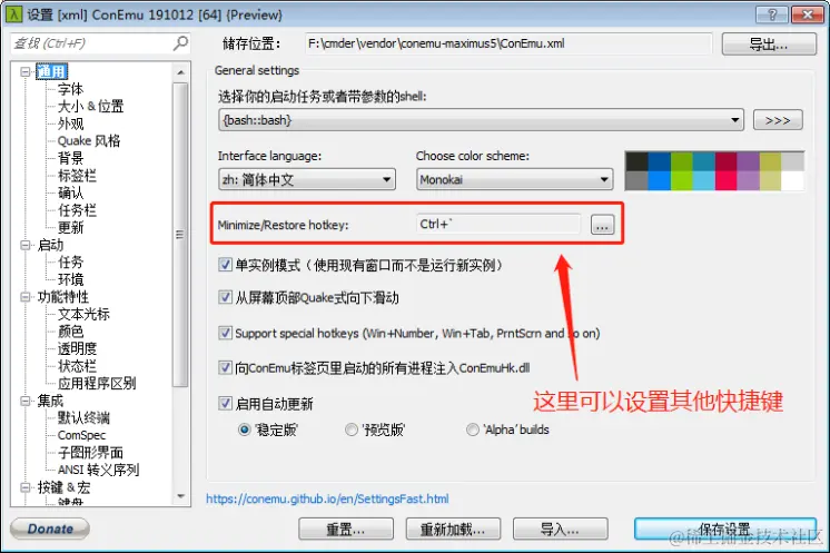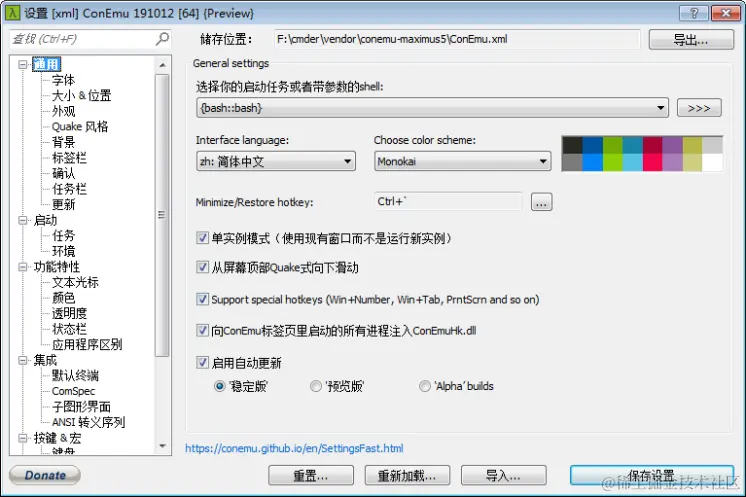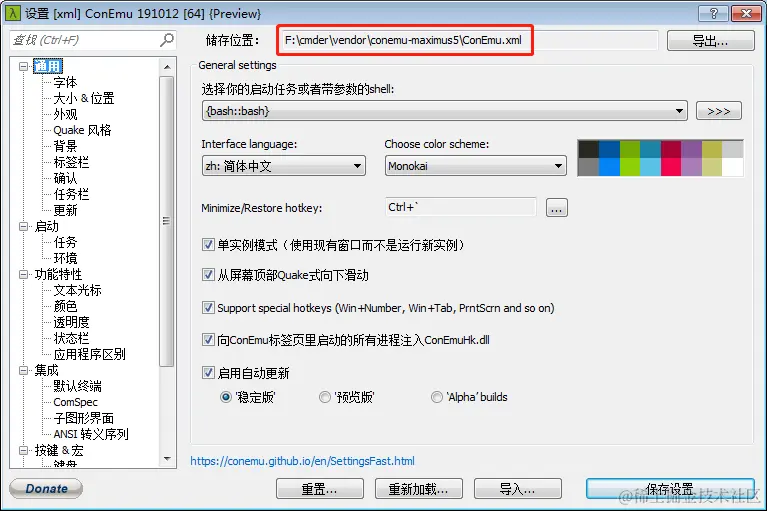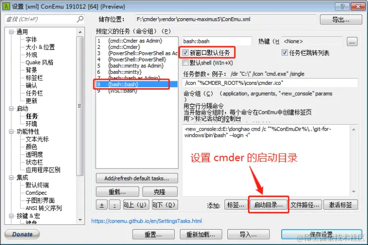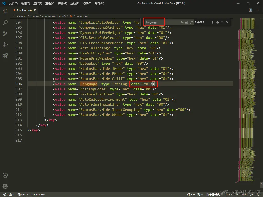 如果设置语言不生效,就按照下图中的路径,找到指定文件,搜索“language”,将 data="en" 改成 data="zh",重启 Cmder 即可。