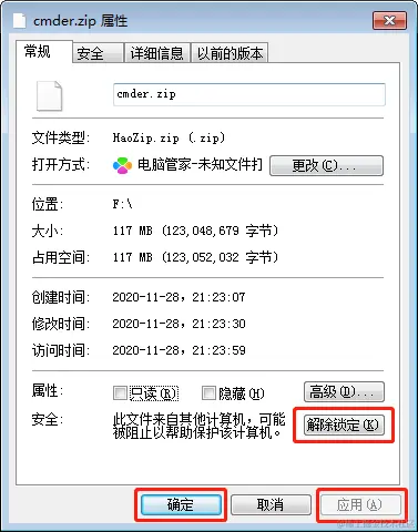 - 下载完成后,将 cmder.zip 放到你想放的盘中,然后“右键点击 cmder.zip - 属性 - 解除锁定 - 应用 - 确定”。