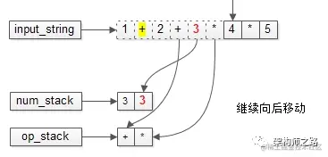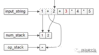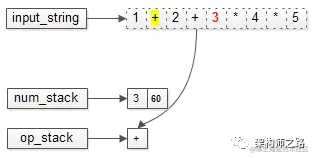 (3)如果栈顶是 *,即将入栈的是 +,栈顶优先级高,需要先计算,再入栈;