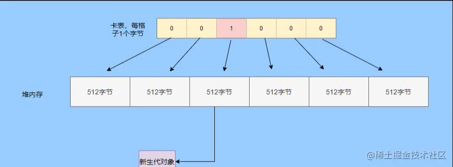 把堆中分为很多块,每块 512 字节(卡页),用字节数组来中的一个元素来表示某一块,1表示脏块,里面存在跨代引用。