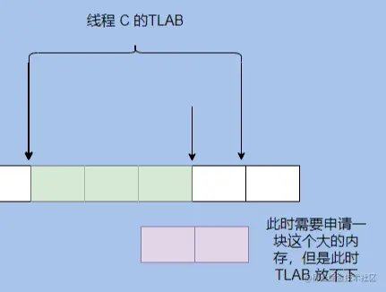 可以看到 TLAB 内部只剩一格大小,申请的对象需要两格,这时候需要再申请一块 TLAB ,之前的那一格就浪费了。
