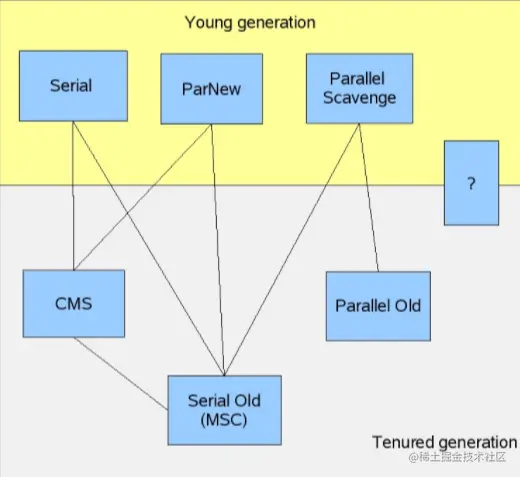 这张图是 2008 年 HostSpot 一位 GC 组成员画的,那时候 G1 还没问世,在研发中,所以画了个问号在上面。