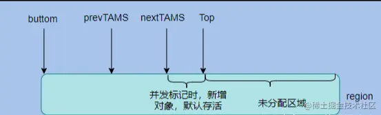 而且 gc 过程中新分配的对象也都认为是活的。每个 region 会维持 TAMS (top at mark start)指针,分别是 prevTAMS 和 nextTAMS 分别标记两次并发标记开始时候 Top 指针的位置。