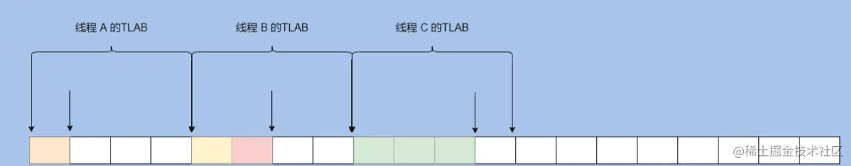 可以看到每个线程有自己的一块内存分配区域,短一点的箭头代表 TLAB 内部的分配指针。