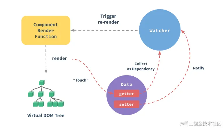 在vue中,每个组件实例都对应一个 watcher 实例,它会在组件渲染的过程中把“接触”(“Touch” 过程)过的数据 property 记录为依赖(Collect as Dependency 过程)。之后当依赖项的 setter 触发时,会通知 watcher(Notify 过程),从而使它关联的组件重新渲染(Trigger re-render 过程)——观察者模式。