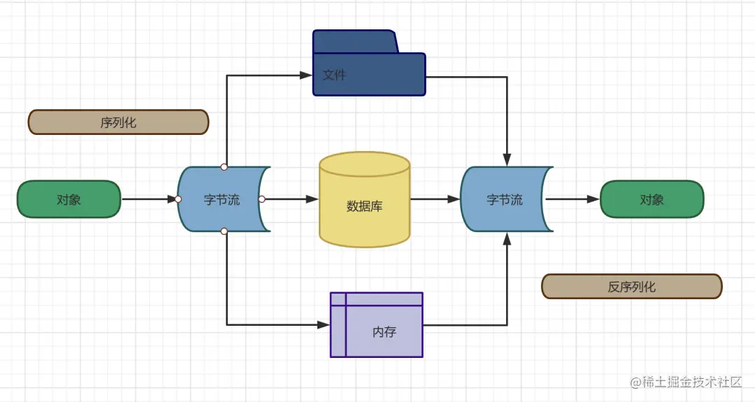 如下图所示,对象被转化为字节流后,被储存在了不同的介质中。这个流程就是序列化。在图的右边,也可以看到从不同的介质中,比如内存,获得字节流并转化为对象,这叫做反序列化。