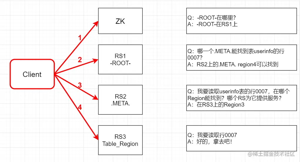 Client请求-ROOT-所在的RS地址,获取.META.表的地址,Client会将-ROOT-的相关信息cache下来,以便下一次快速访问。