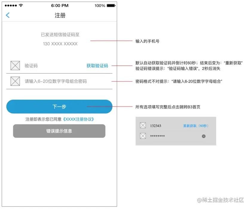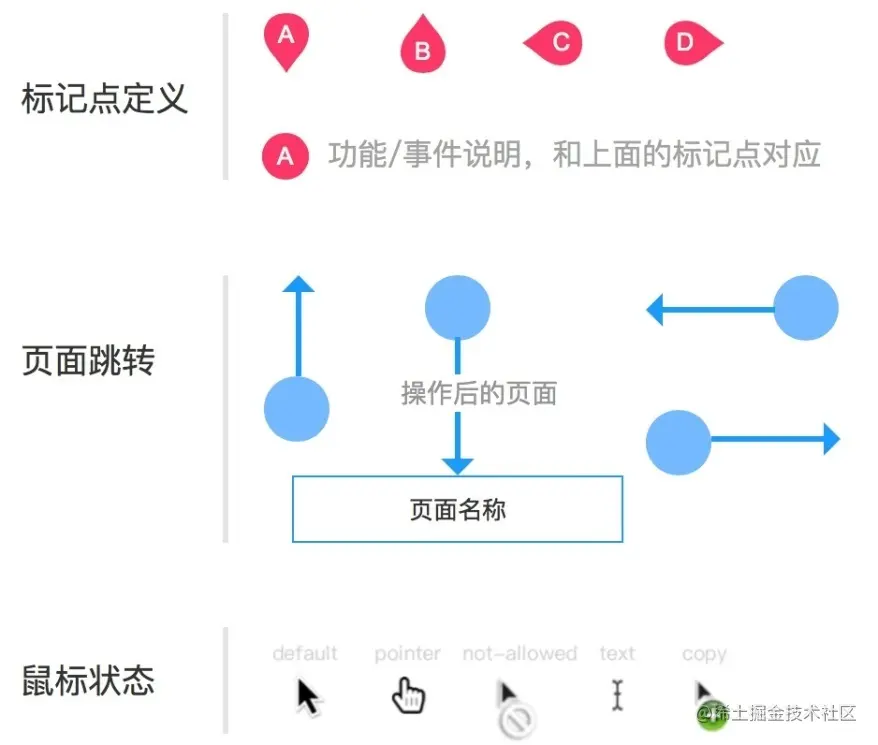 在做交互稿标记之前,定义规范好每个标记的含义,形成统一的规范,使得团队成员易于理解。如,用水滴表示标注的功能,用圆圈+箭头的形式来标识页面跳转关系。