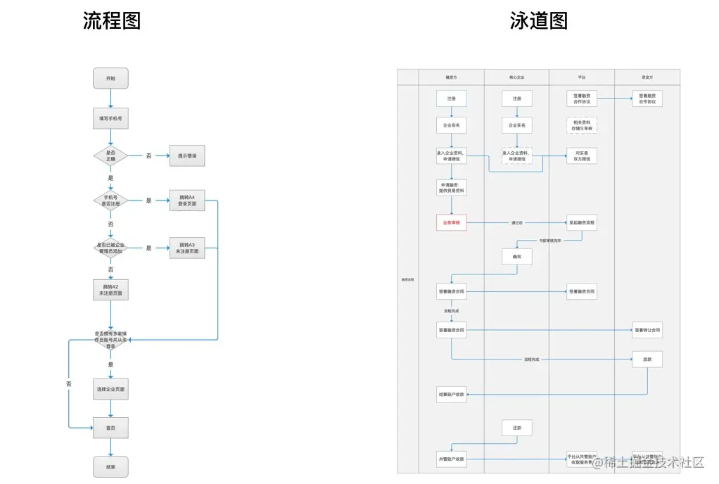 用流程图梳理产品业务的逻辑关系,常用的流程图分为单向流程图和泳道图(涉及到多个角色)。