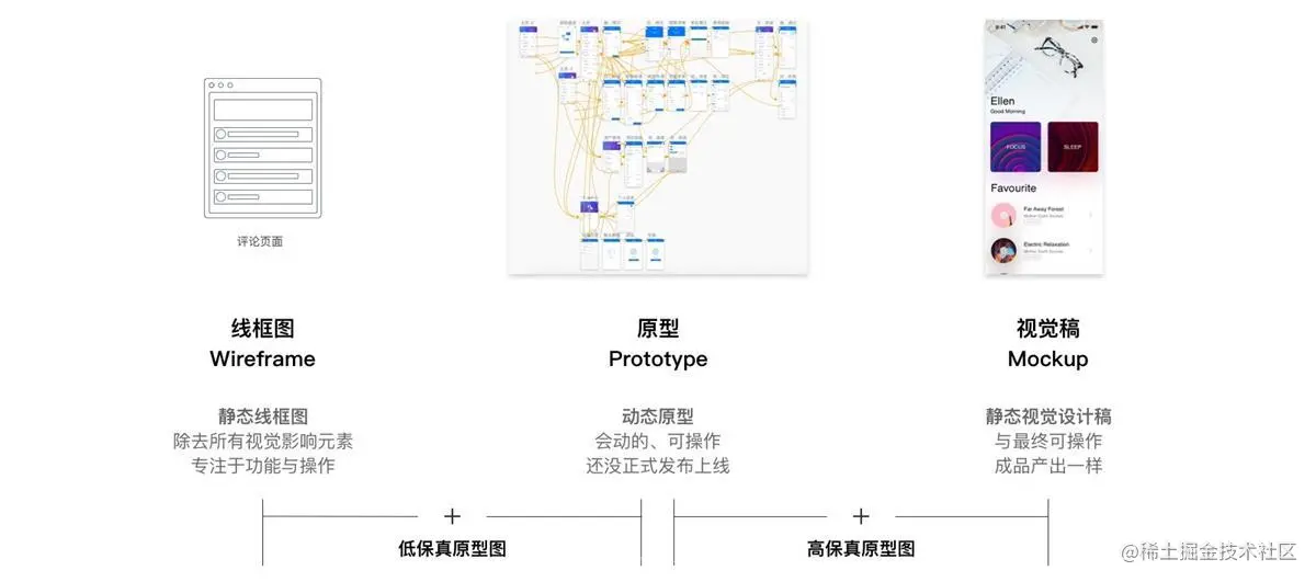 设计时原型的类别也需要关注,每个项目启动时对原型的需求不一定都相同,交流的对象也有可能会对原型的类别产生混淆,以为线框图(Wireframe)、原型(Prototype)和视觉稿(Mockup)是一个东西,设计开始前最好先与产品经理/甲方确认要绘制什么类型的原型。