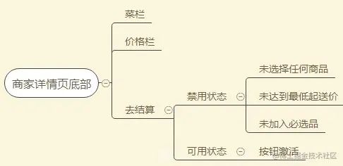 下面的原型图标注以饿了么商家详情页结算订单为例,先用思维脑图梳理功能状态,这样能避免遗漏一些边界条件。