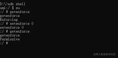 - disabled:关闭,SELinux 没有运行 这里再多说一点,Android的硬件检测的两种方案之一就是通过SELinux来获取,另外一个就是证书链认证,请参考以前写的文章。 然后继续执行上述命令。