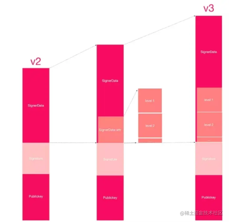 - v3 版本签名块也分成同样的三部分,与 v2 不同的是在SignerData 部分,v3 新增了 attr 块,其中是由更小的level 块组成。每个 level 块中可以存储一个证书信息。前一个 level 块证书验证下一个 level 证书,以此类推。最后一个 level 块的证书,要符合 SignerData 中本身的证书,即用来签名整个 APK 的公钥所属于的证书