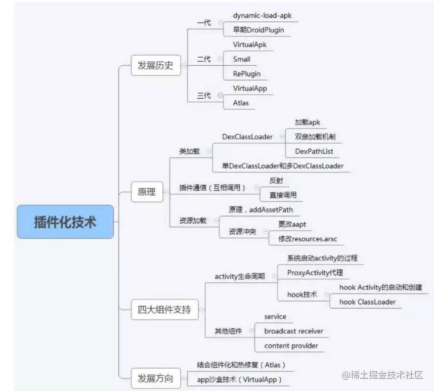 - 插件化是指将 APK 分为宿主和插件的部分。把需要实现的模块或功能当做一个独立的提取出来,在 APP 运行时,我们可以动态的载入或者替换插件部分,减少宿主的规模