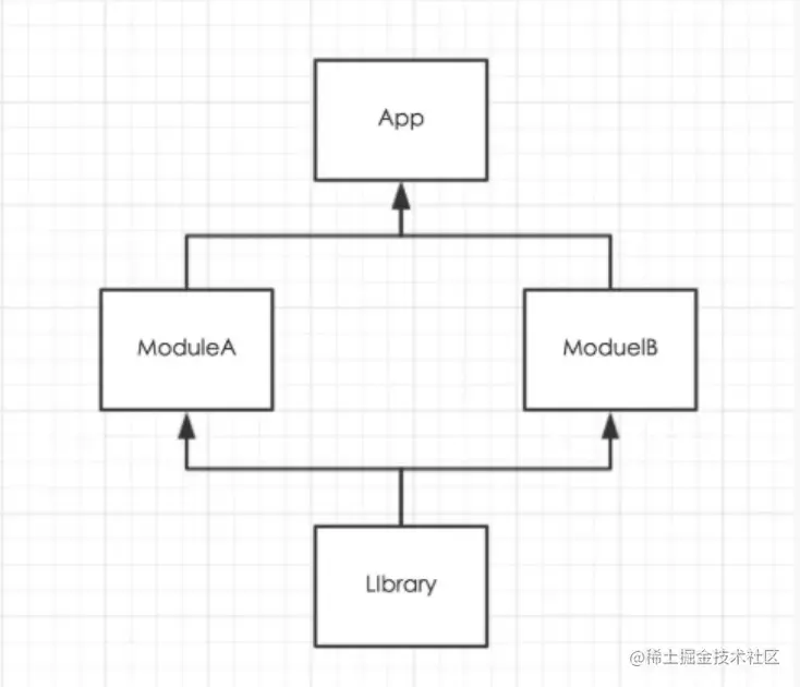 App 是主 application,ModuleA 和 ModuleB 是两个业务模块(相对独立,互不影响),Library 是基础模块,包含所有模块需要的依赖库,以及一些工具类:如网络访问、时间工具等