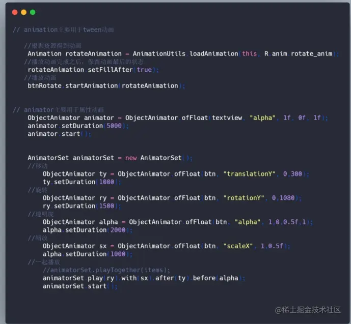 - 动画的种类:前者只有透明度,旋转,平移,伸缩 4 种属性,而对于后者,只要是该控件的属性,且有 setter 该属性的方法就都可以对该属性执行一种动态变化的效果。