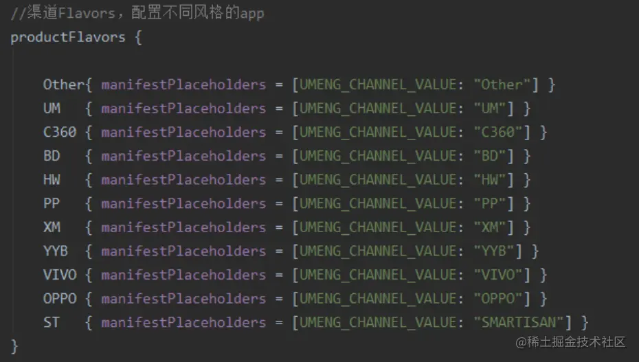 - 接着在 app 目录下的 build.gradle 中配置productFlavors,也就是配置打包的渠道: