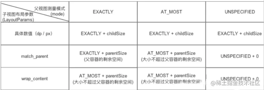 - 决定因素:值由子 View 的布局参数 LayoutParams 和父容器的 MeasureSpec 值共同决定。具体规则见下图:
