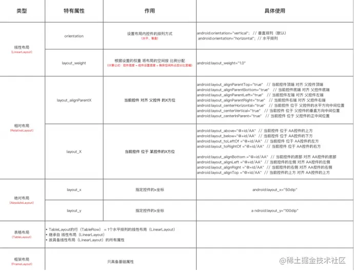14、请例举 Android 中常用布局类型,并简述其用法以及排版效率