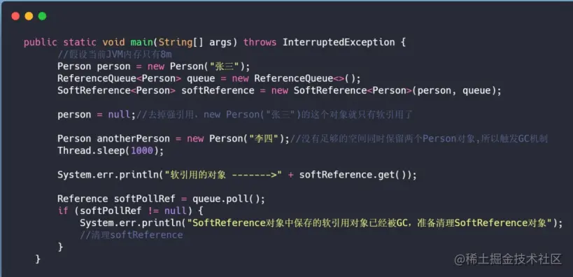 - 举个场景例子:SoftReference 对象是用来保存软引用的,但它同时也是一个 Java 对象,所以当软引用对象被回收之后,虽然这个 SoftReference 对象的 get 方法返回null,但 SoftReference 对象本身并不是 null,而此时这个 SoftReference 对象已经不再具有存在的价值,需要一个适当的清除机制,避免大量 SoftReference 对象带来的内存泄露